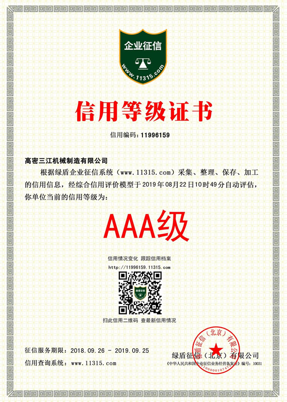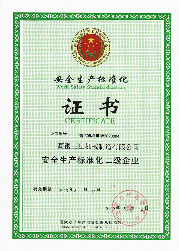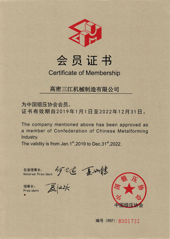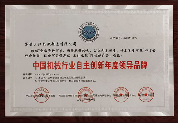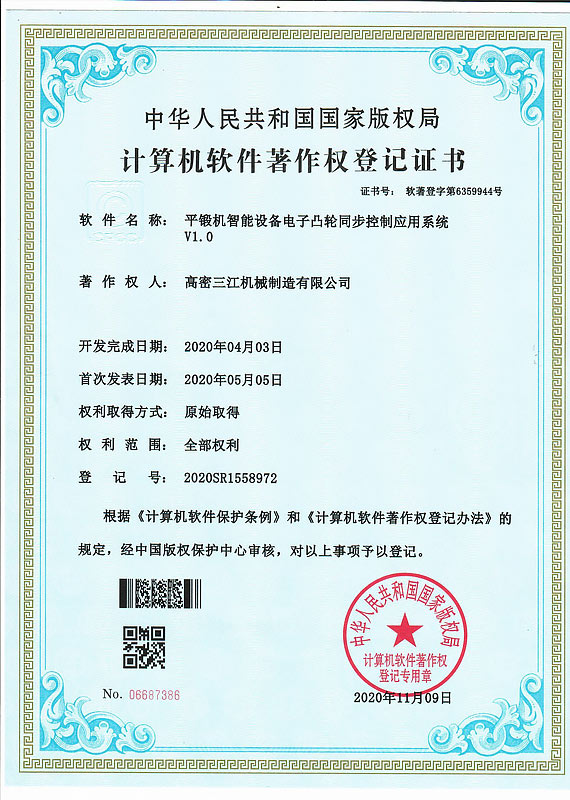 三江机械“以创新求发展”,注重知识产权申请和?;?,近年来已获得国家高新技术企业和山东省“专精特新”企业,拥有ISO9001质量管理体系认证和欧盟CE认证。公司注重研发创新,共引进国内先进技术成果3项,取得发明专利5项,实用新型专利30余项,软件著作权5项。先后与南京航空航天大学、山东理工大学、青岛科技大学等高校在金属成形工艺和新材料应用等领域展开合作。